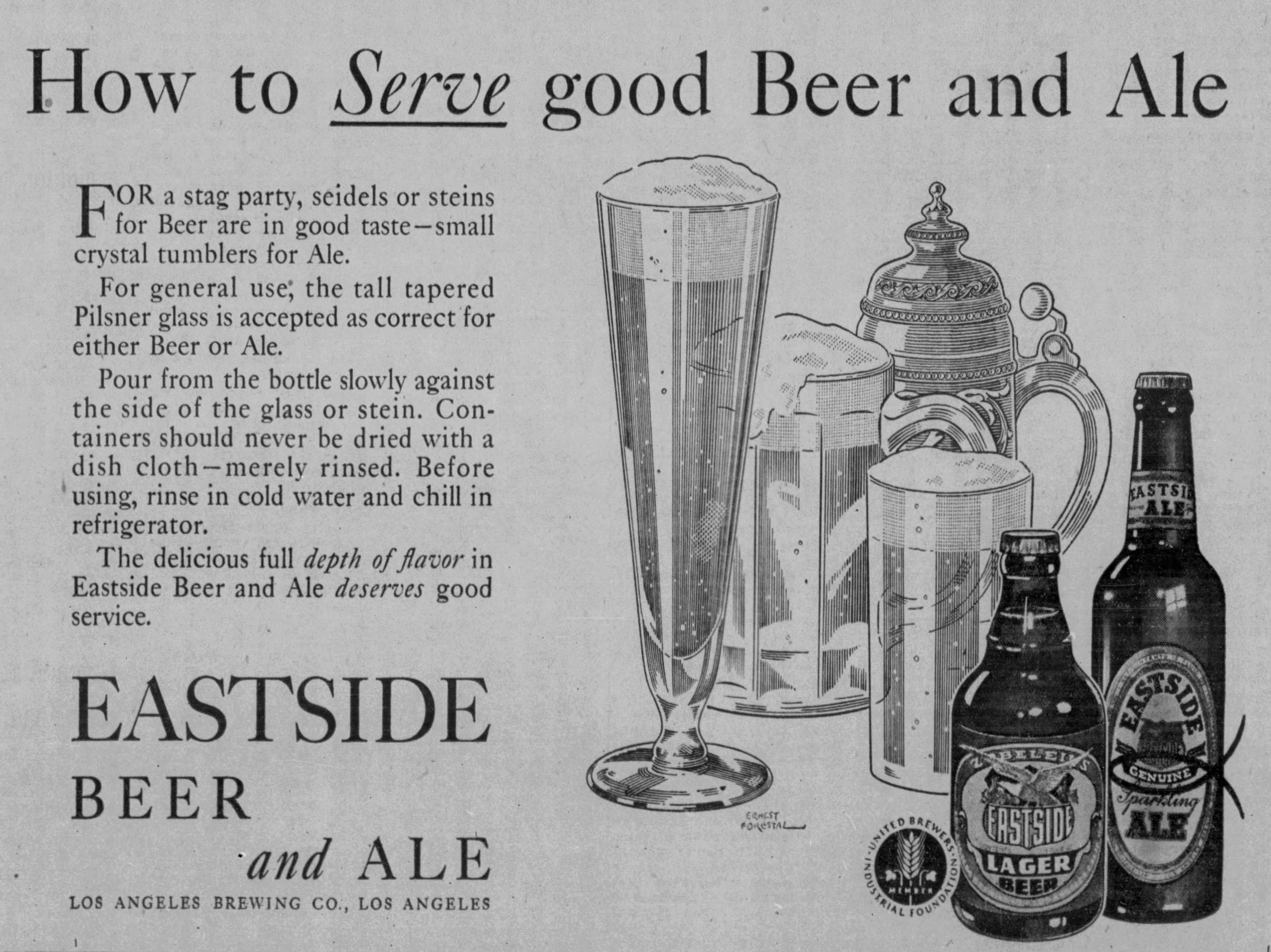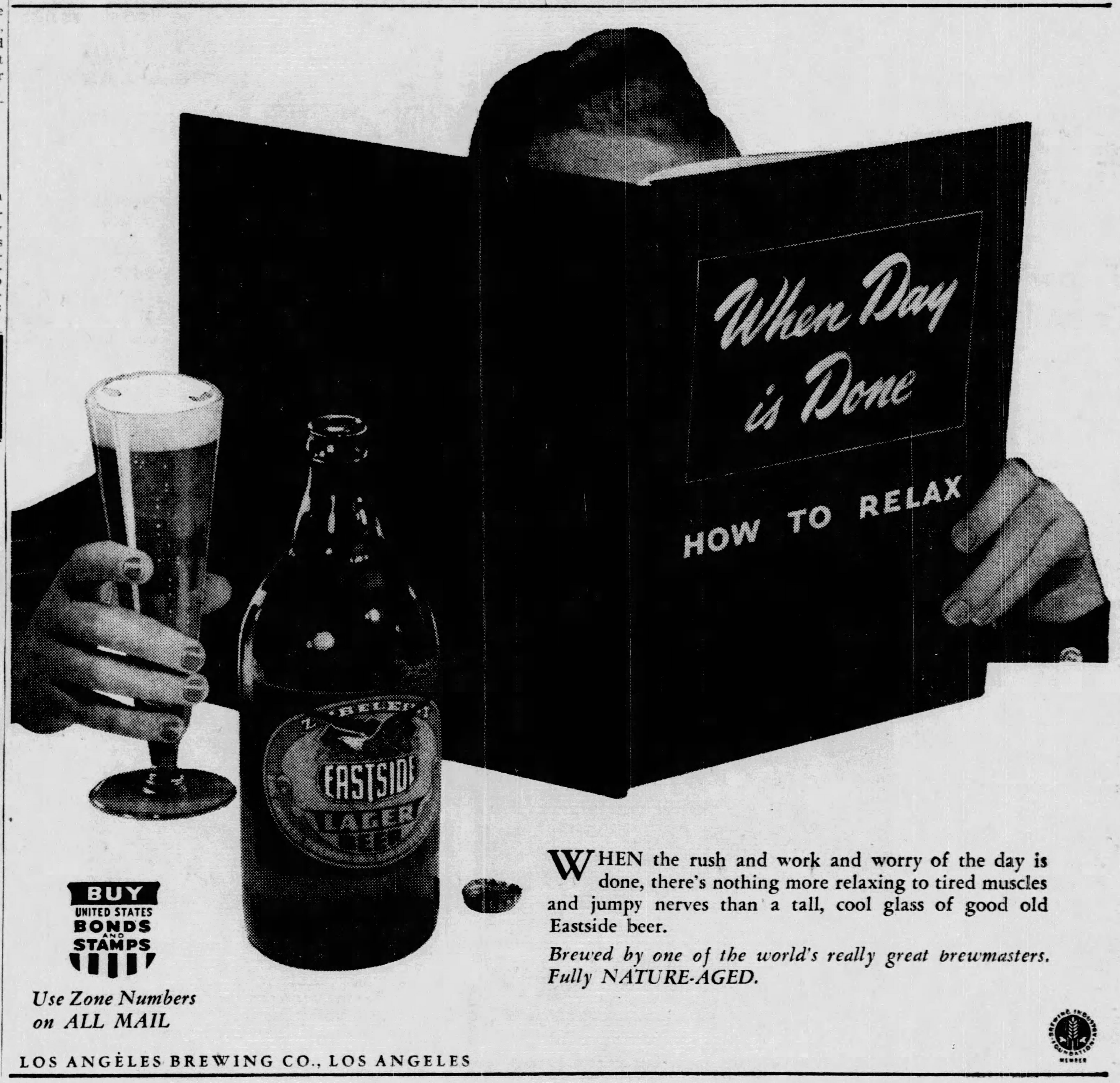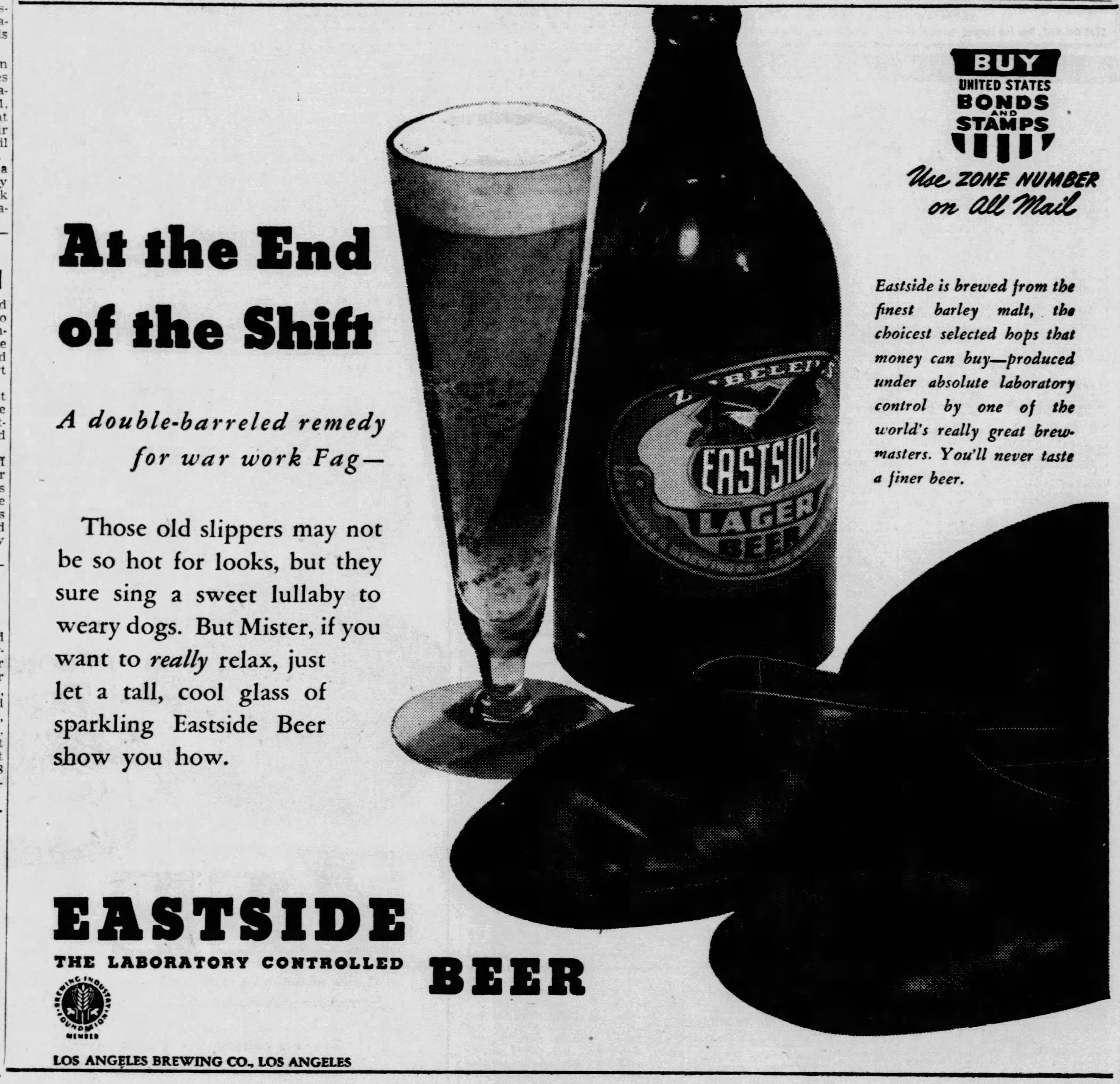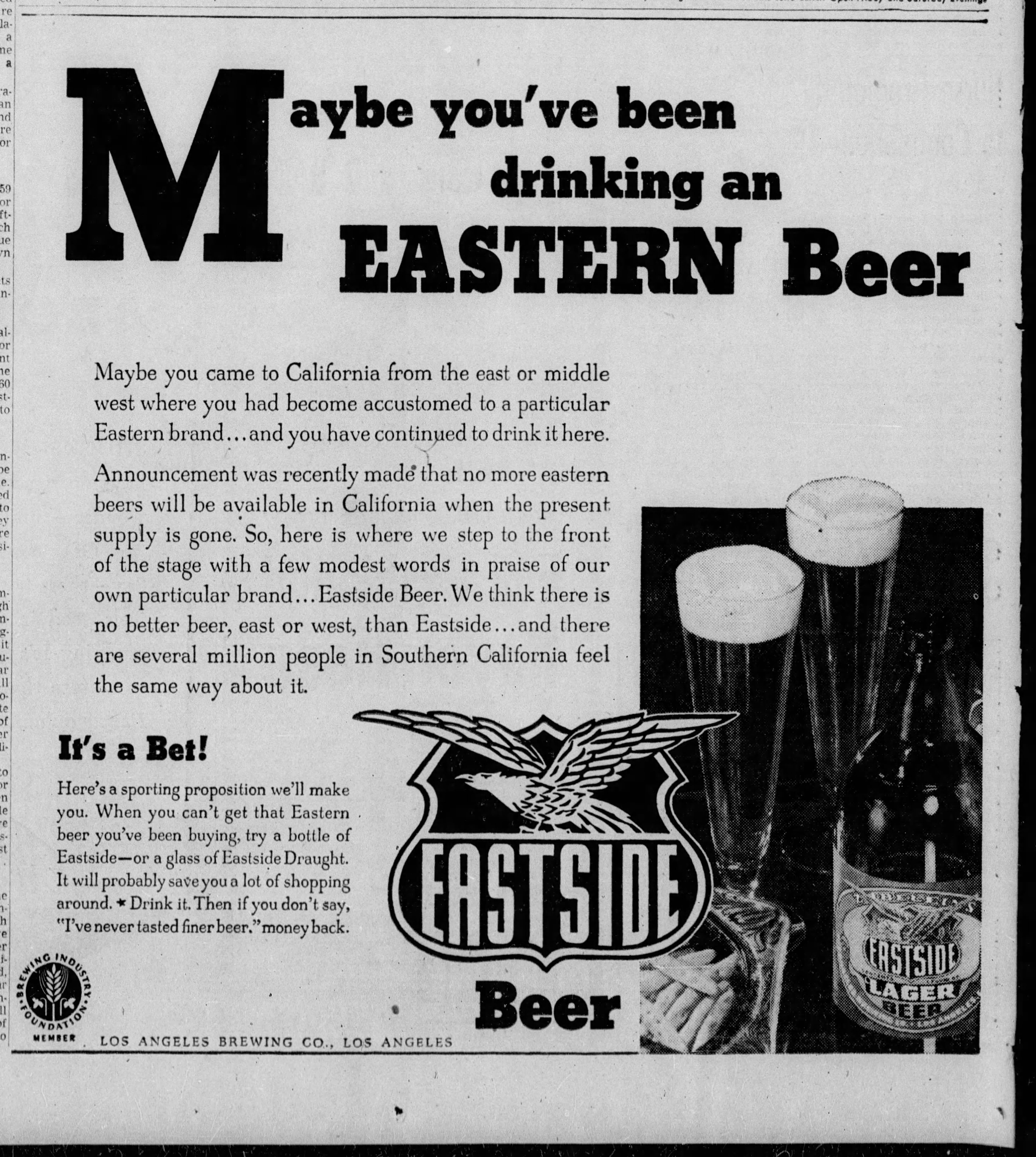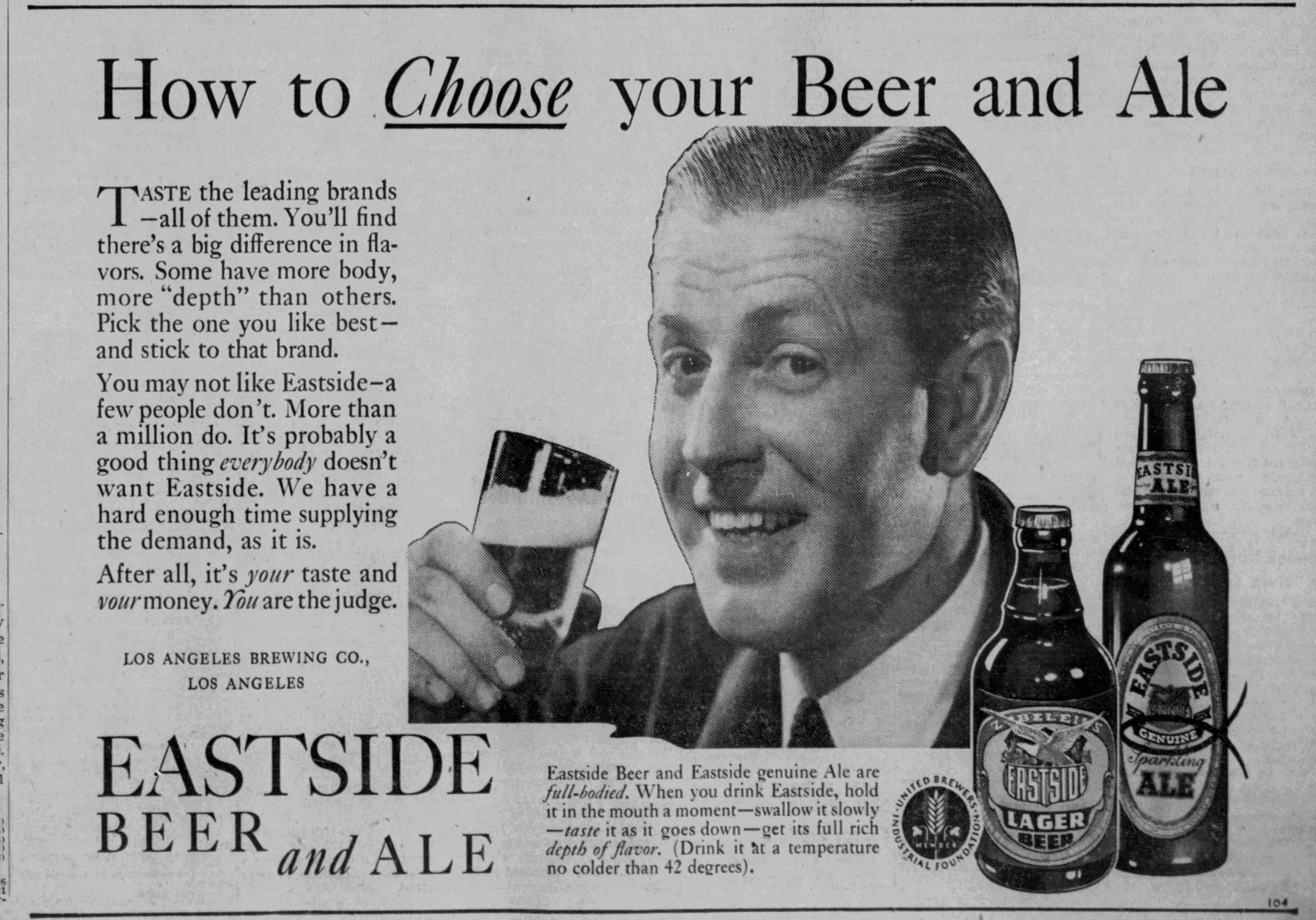 “The Maier Brewing Company started as the Ed. Preuss & Company Philadelphia Brewery in 1874. The following year, it became the D. Mahlstedt Company Philadelphia Brewery, and then the Maier & Zobelein Brewery, located in Los Angeles, in 1882. When Maier and Zobelein dissolved their partnership in 1907, the brewery became the Maier Brewing Company, located at 500 East Commercial Street, Los Angeles. Existing for several decades, the Maier Brewing Company was purchased by the General Brewing Company in 1971, but was later closed in 1974. Eastside Beer was bottled by Los Angeles Brewing Company, owned by George Zobelein, a former partner of Maier and Zobelein Brewery. After the two split in 1907, Zobelein named his new beer ‘Eastside’ since Los Angeles Brewing Company was located east of the Los Angeles River at 600 Moulton Avenue, and the 1920-2026 block of Main Street. The bottling facility was eventually sold and became the Pabst Brewery.”