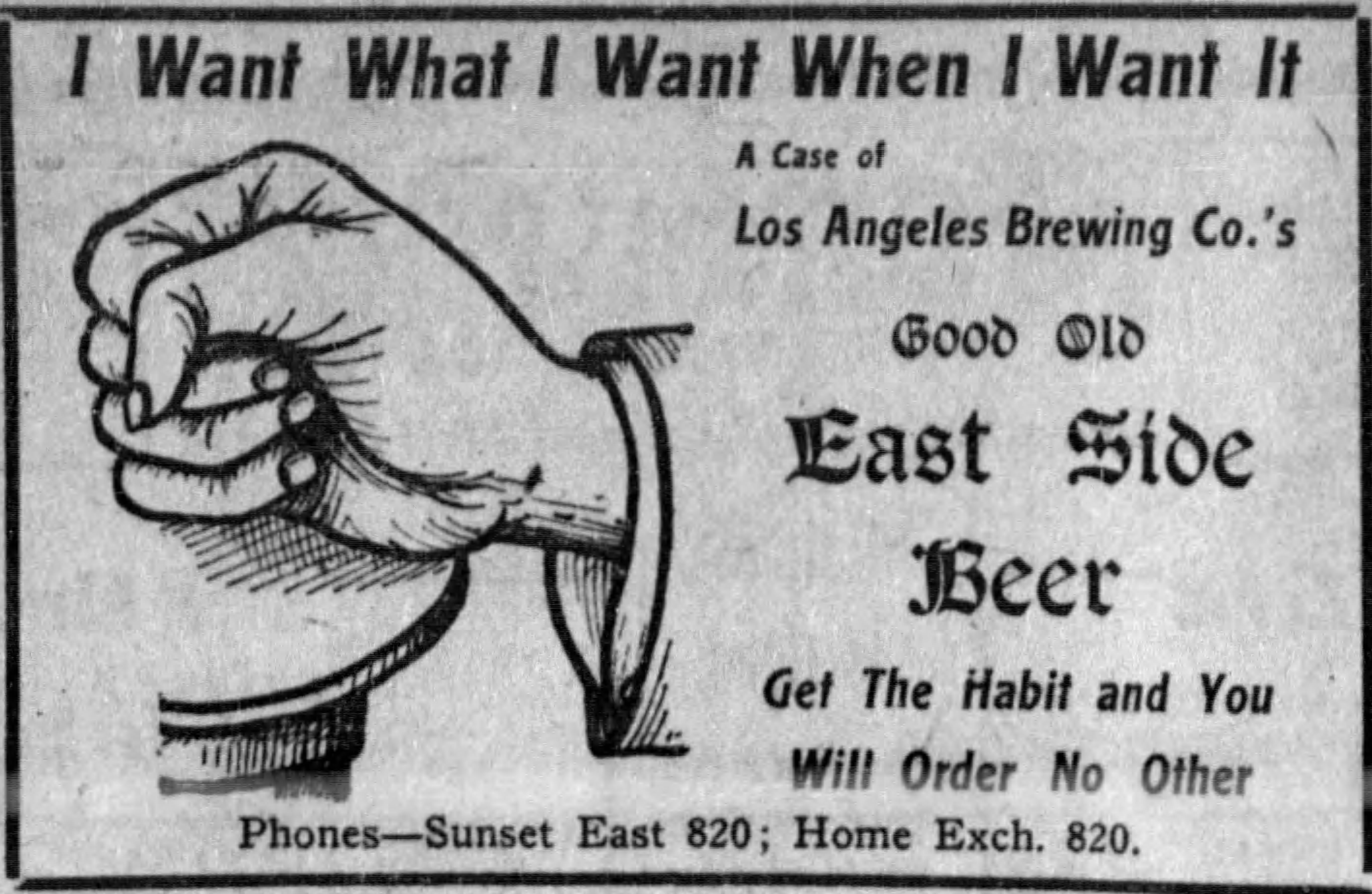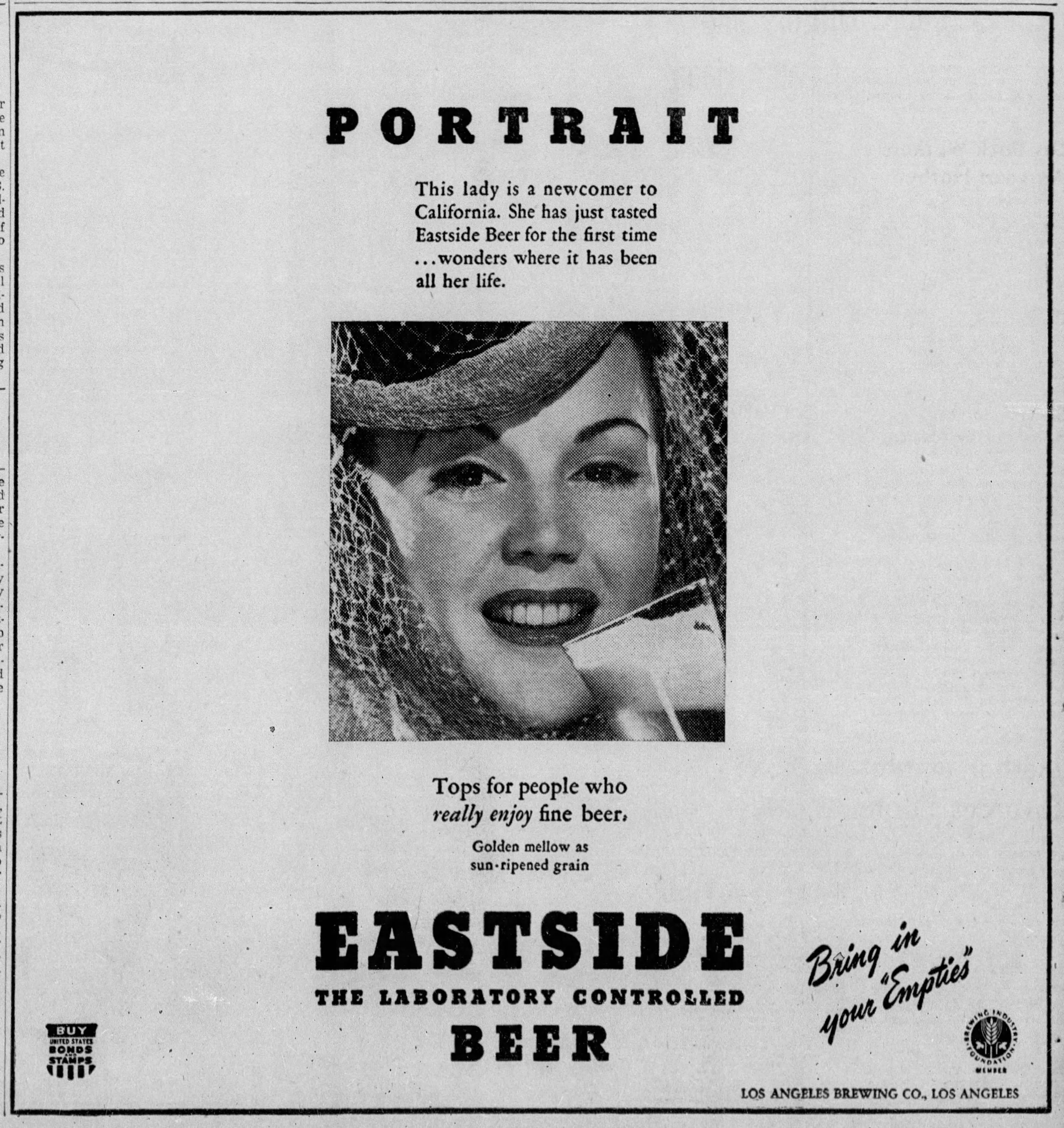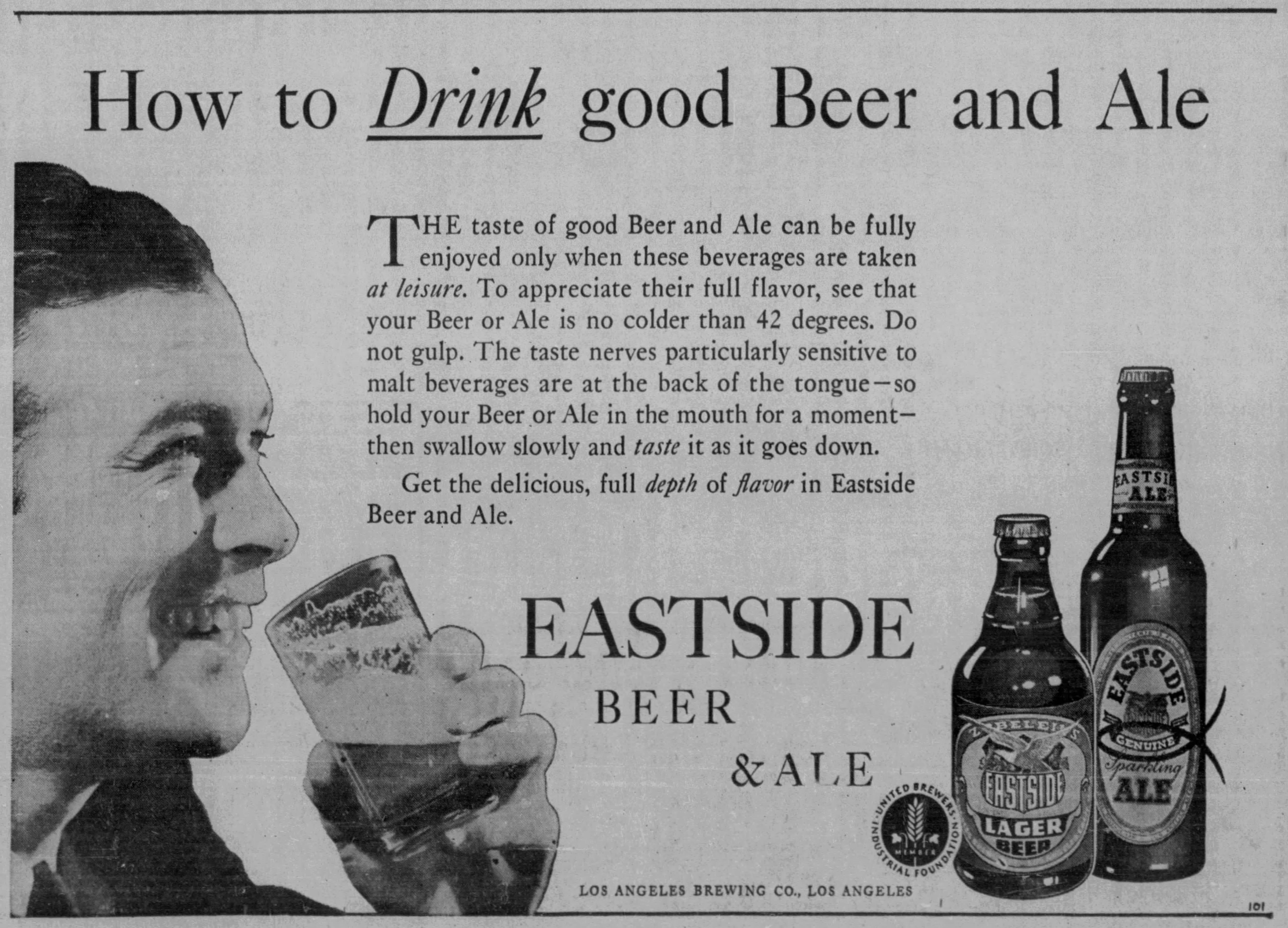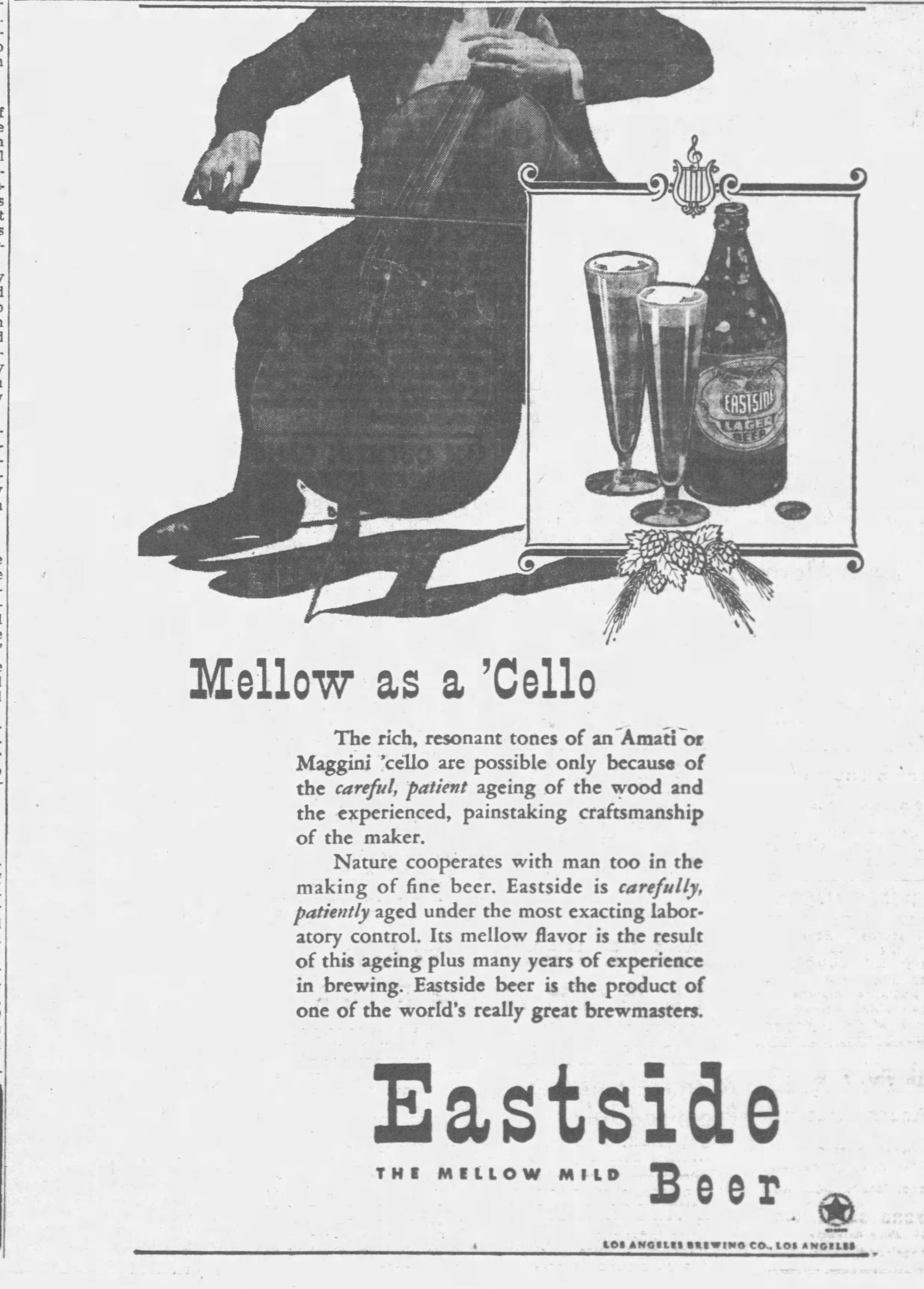 “The Maier Brewing Company started as the Ed. Preuss & Company Philadelphia Brewery in 1874. The following year, it became the D. Mahlstedt Company Philadelphia Brewery, and then the Maier & Zobelein Brewery, located in Los Angeles, in 1882. When Maier and Zobelein dissolved their partnership in 1907, the brewery became the Maier Brewing Company, located at 500 East Commercial Street, Los Angeles. Existing for several decades, the Maier Brewing Company was purchased by the General Brewing Company in 1971, but was later closed in 1974. Eastside Beer was bottled by Los Angeles Brewing Company, owned by George Zobelein, a former partner of Maier and Zobelein Brewery. After the two split in 1907, Zobelein named his new beer ‘Eastside’ since Los Angeles Brewing Company was located east of the Los Angeles River at 600 Moulton Avenue, and the 1920-2026 block of Main Street. The bottling facility was eventually sold and became the Pabst Brewery.”