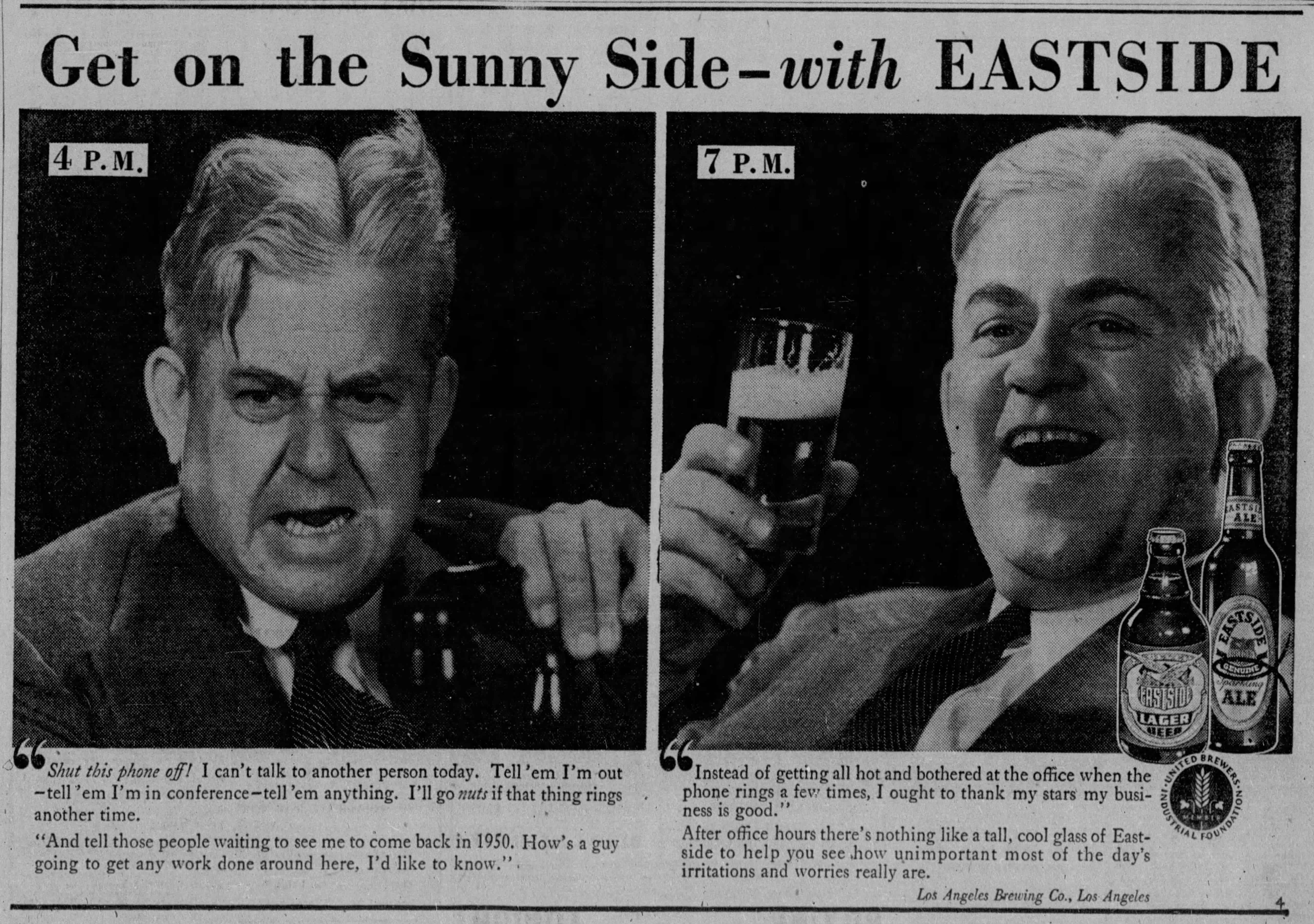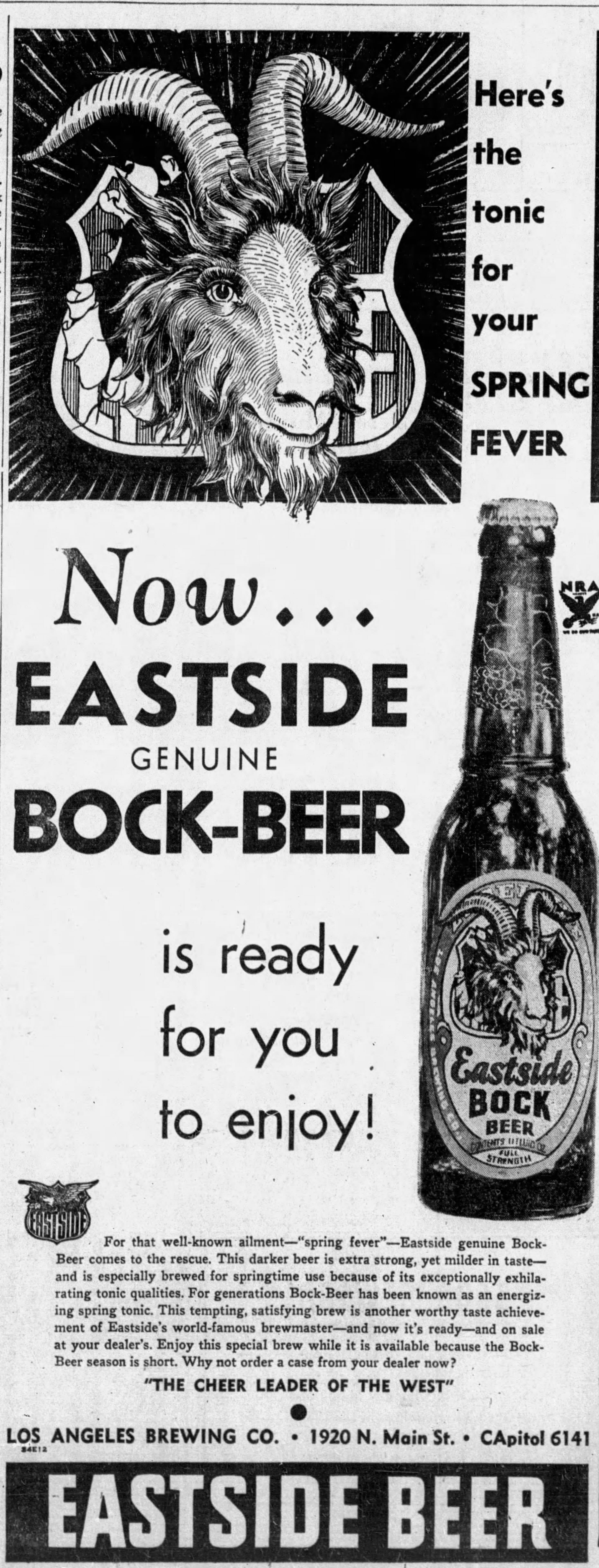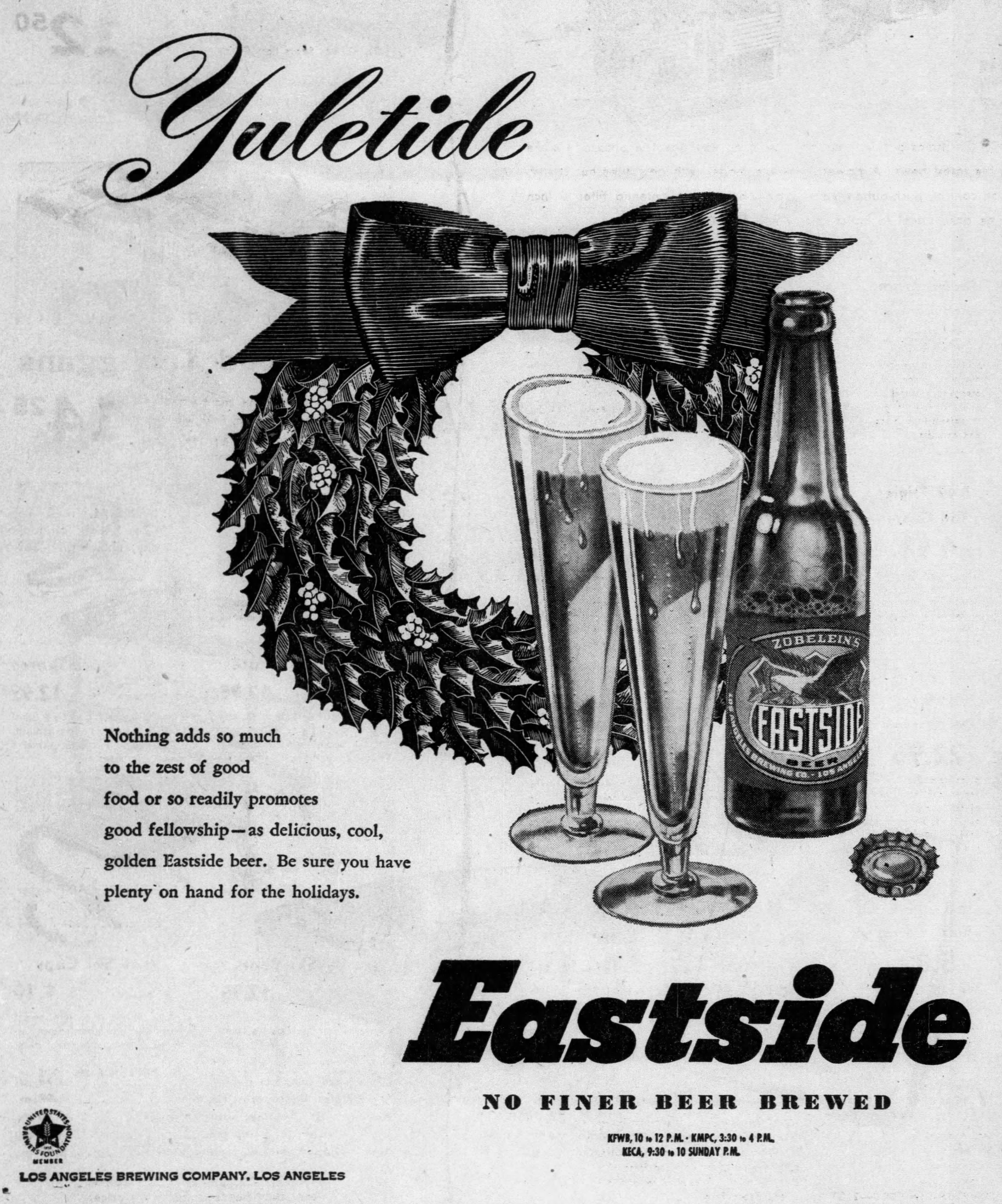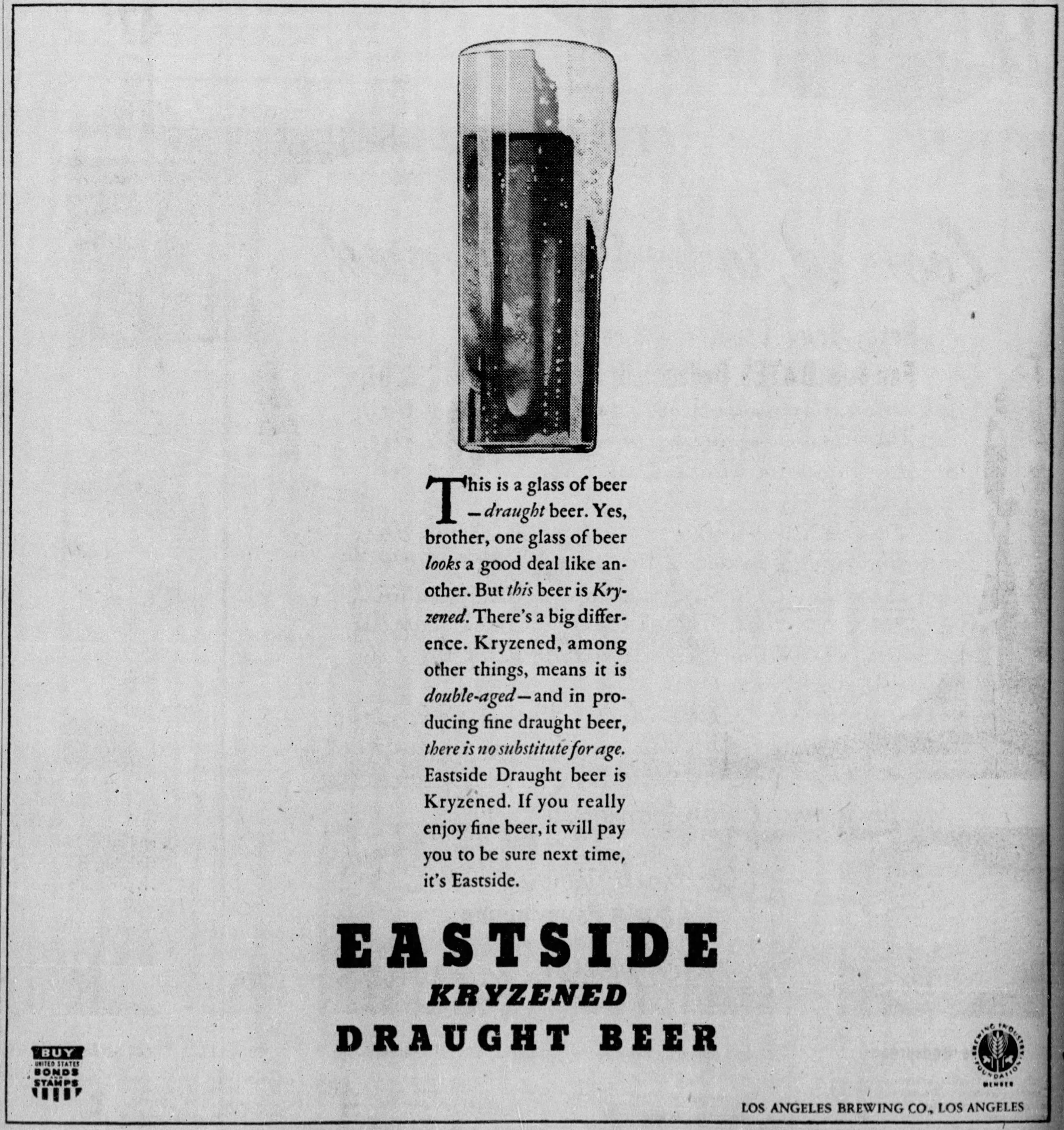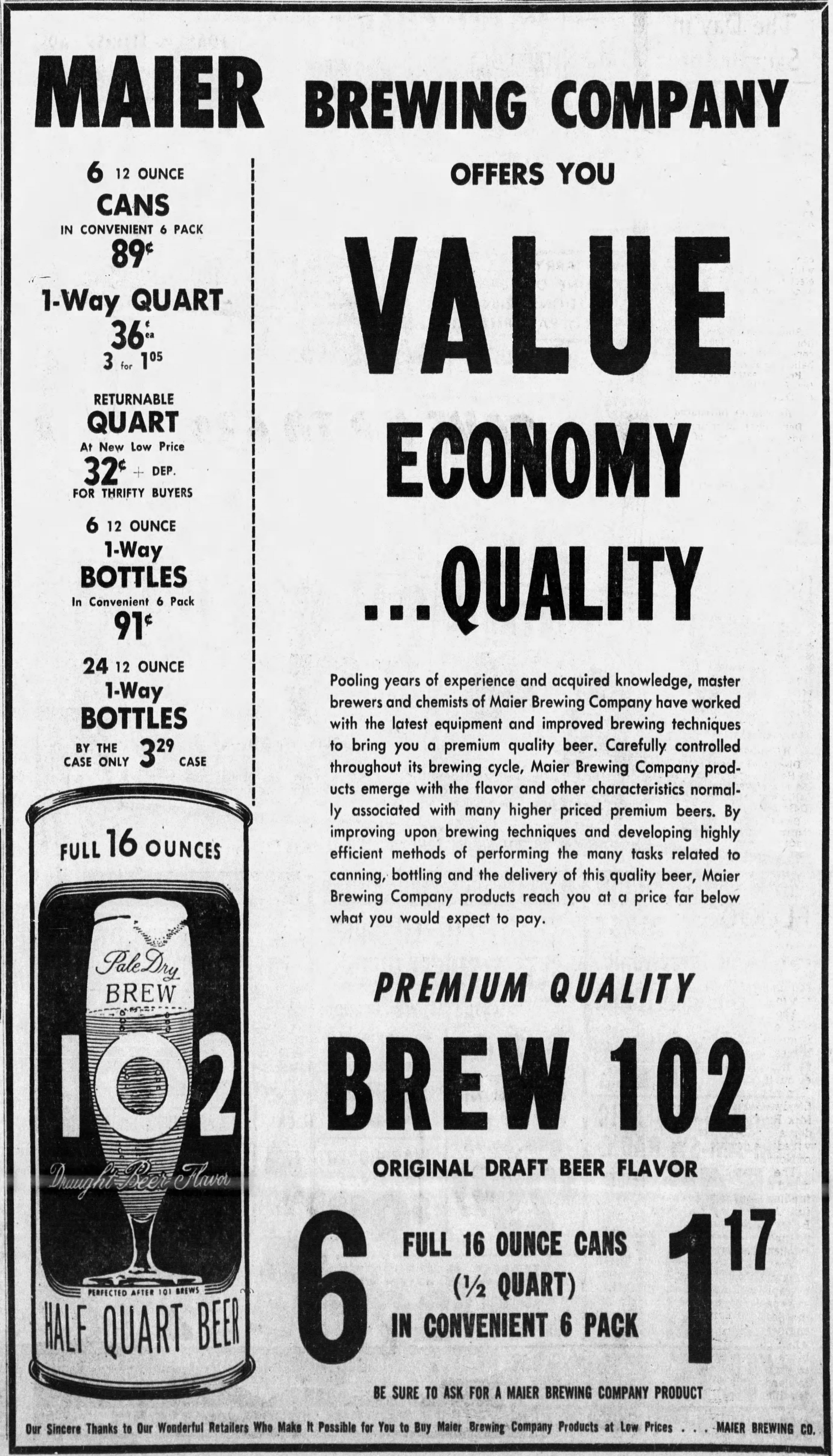“The Maier Brewing Company started as the Ed. Preuss & Company Philadelphia Brewery in 1874. The following year, it became the D. Mahlstedt Company Philadelphia Brewery, and then the Maier & Zobelein Brewery, located in Los Angeles, in 1882. When Maier and Zobelein dissolved their partnership in 1907, the brewery became the Maier Brewing Company, located at 500 East Commercial Street, Los Angeles. Existing for several decades, the Maier Brewing Company was purchased by the General Brewing Company in 1971, but was later closed in 1974. Eastside Beer was bottled by Los Angeles Brewing Company, owned by George Zobelein, a former partner of Maier and Zobelein Brewery. After the two split in 1907, Zobelein named his new beer ‘Eastside’ since Los Angeles Brewing Company was located east of the Los Angeles River at 600 Moulton Avenue, and the 1920-2026 block of Main Street. The bottling facility was eventually sold and became the Pabst Brewery.”