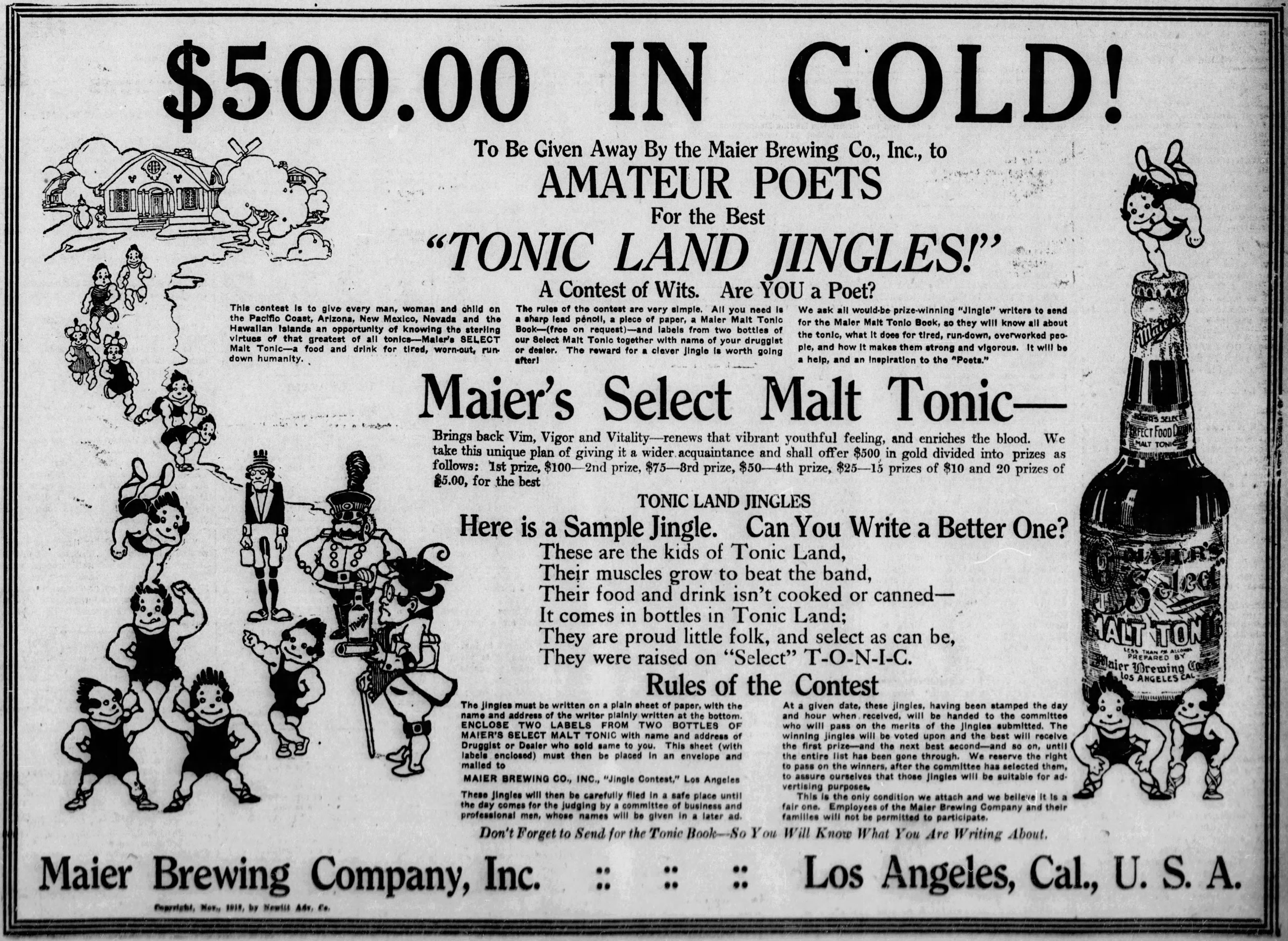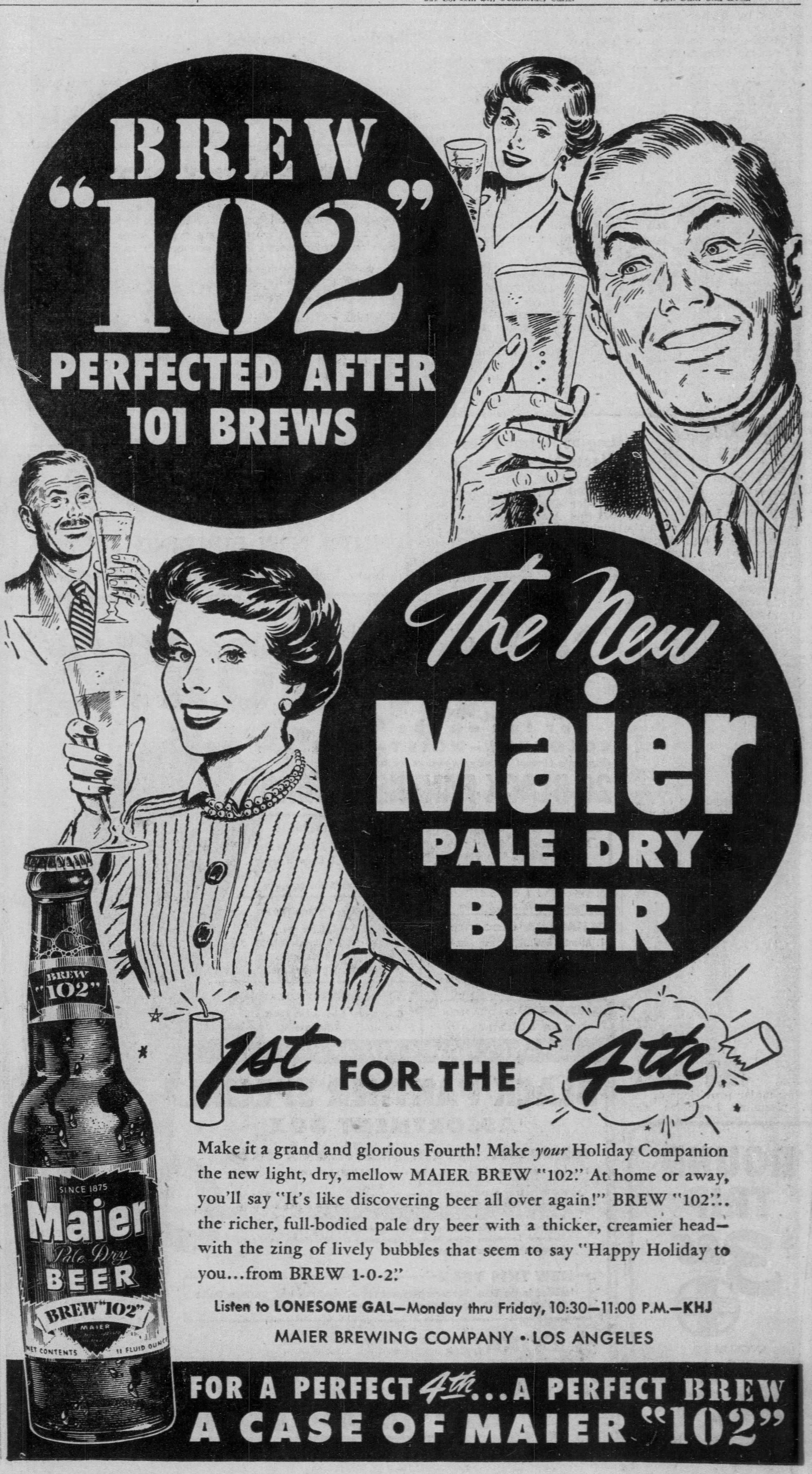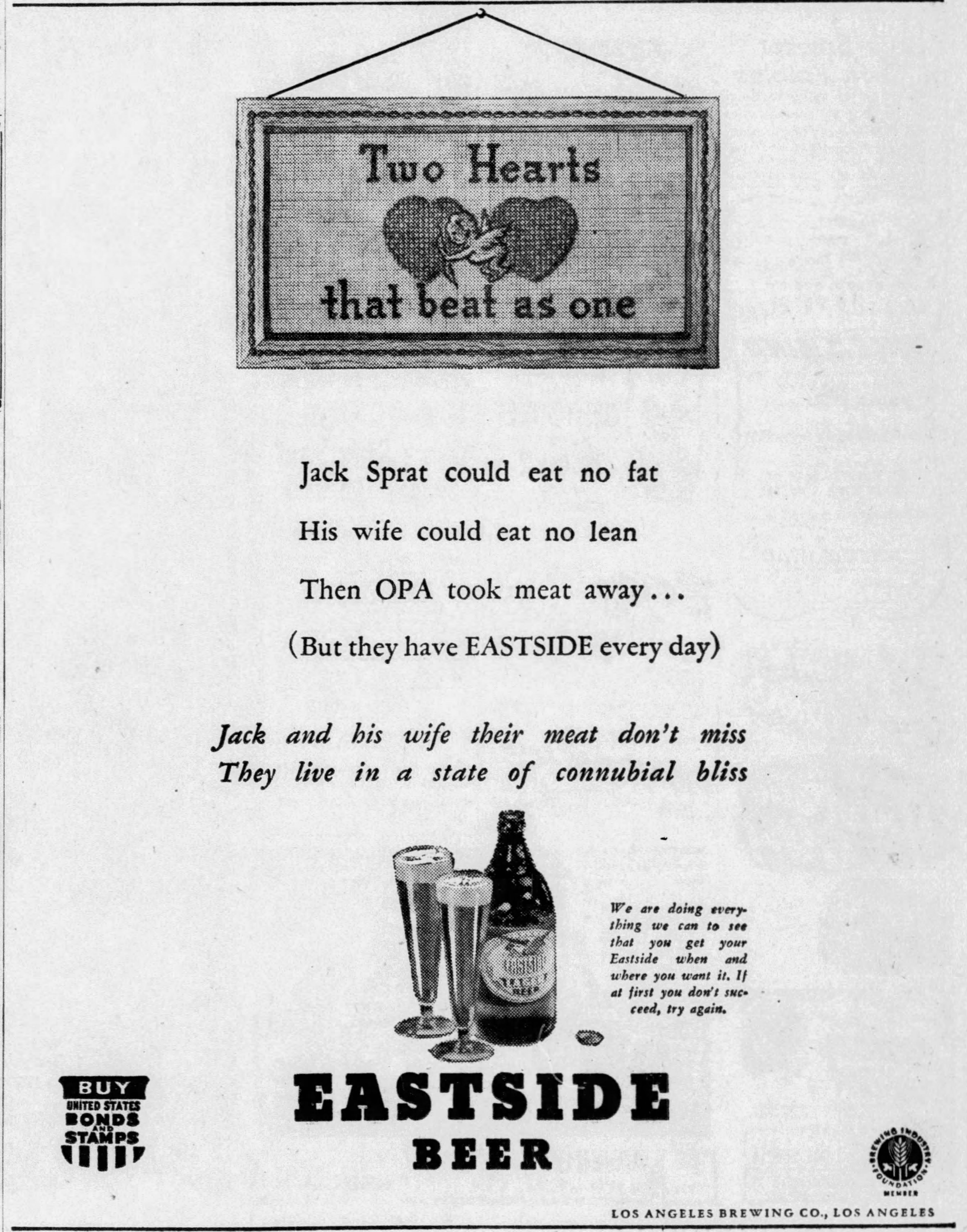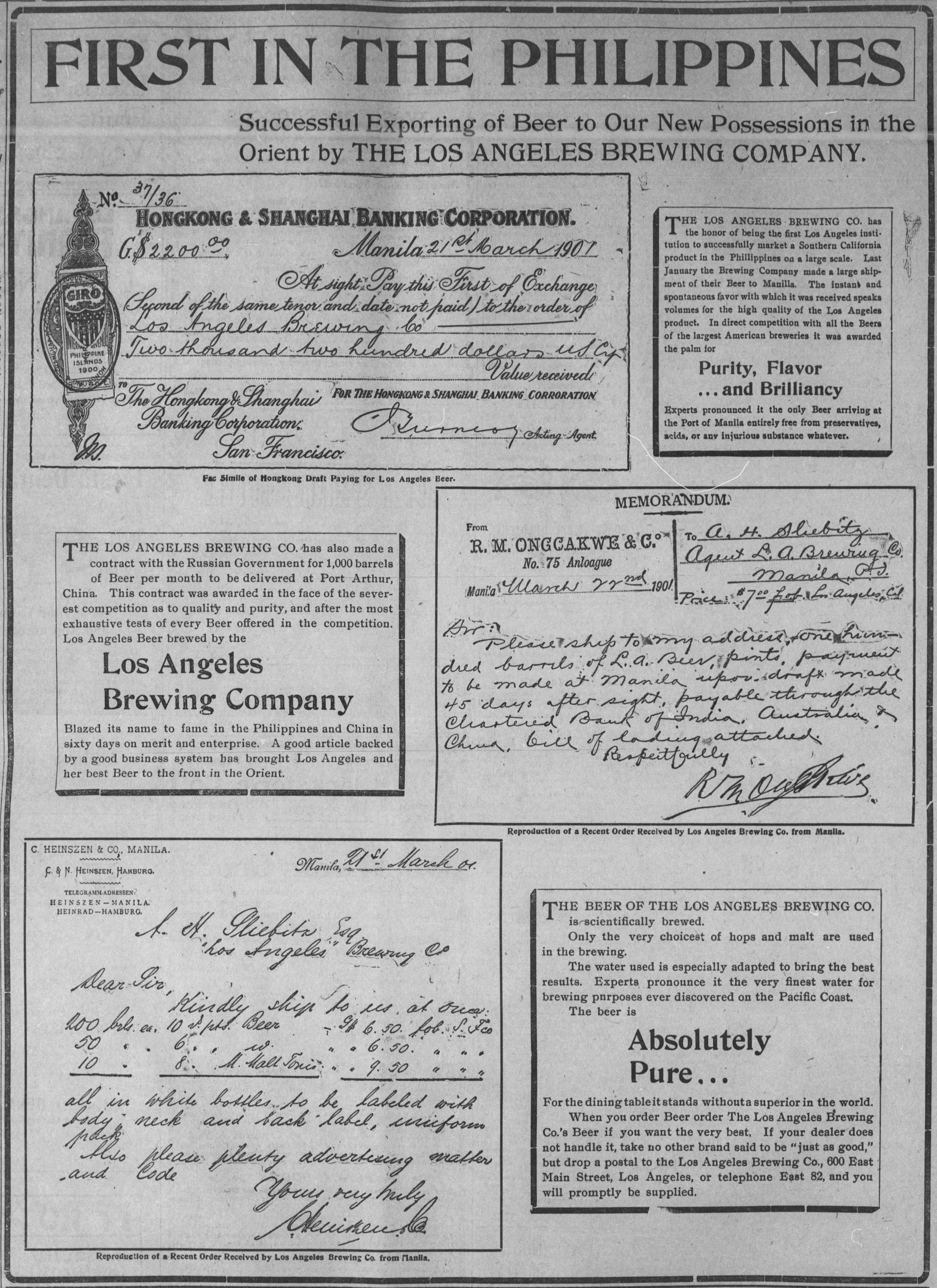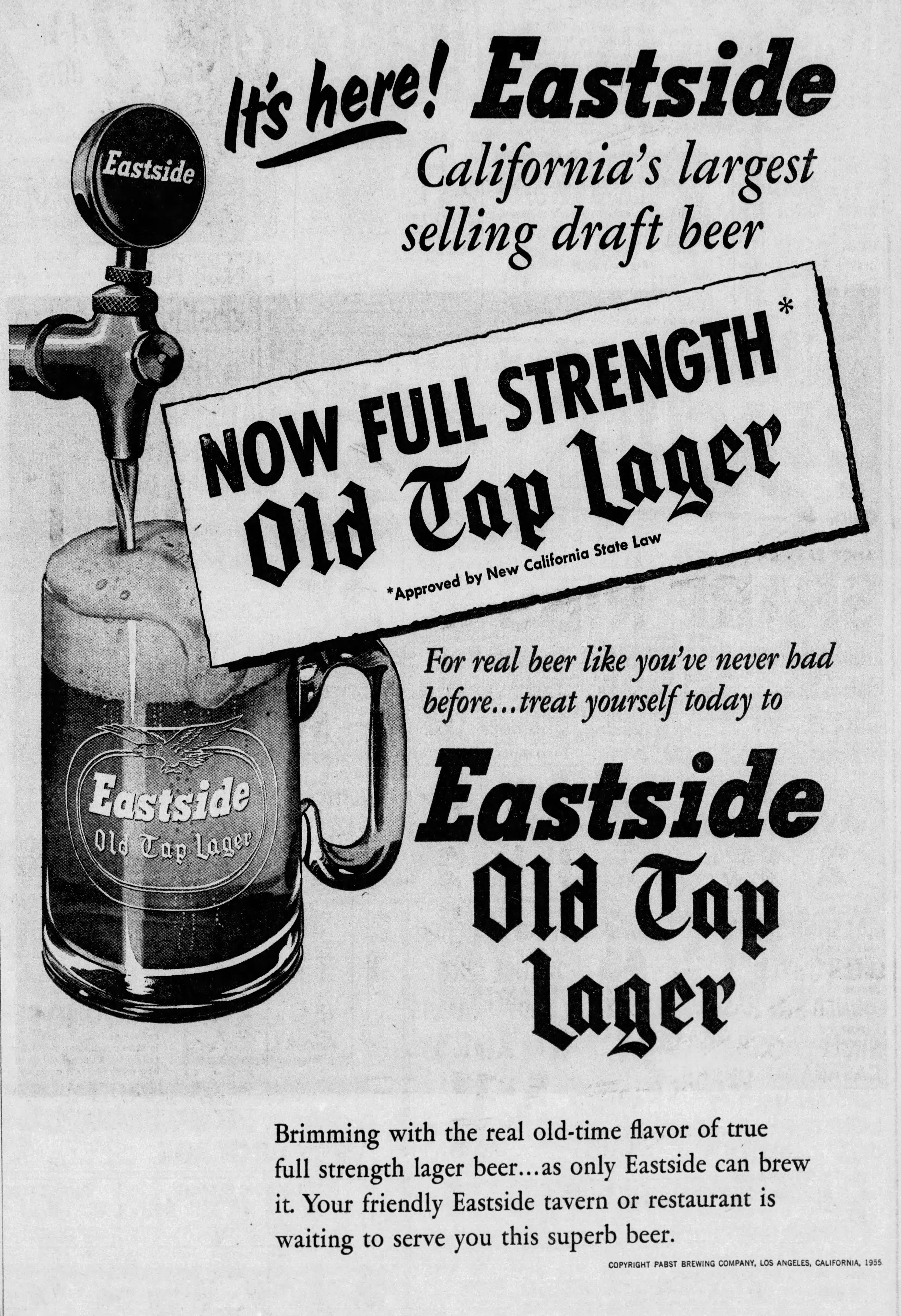 “The Maier Brewing Company started as the Ed. Preuss & Company Philadelphia Brewery in 1874. The following year, it became the D. Mahlstedt Company Philadelphia Brewery, and then the Maier & Zobelein Brewery, located in Los Angeles, in 1882. When Maier and Zobelein dissolved their partnership in 1907, the brewery became the Maier Brewing Company, located at 500 East Commercial Street, Los Angeles. Existing for several decades, the Maier Brewing Company was purchased by the General Brewing Company in 1971, but was later closed in 1974. Eastside Beer was bottled by Los Angeles Brewing Company, owned by George Zobelein, a former partner of Maier and Zobelein Brewery. After the two split in 1907, Zobelein named his new beer ‘Eastside’ since Los Angeles Brewing Company was located east of the Los Angeles River at 600 Moulton Avenue, and the 1920-2026 block of Main Street. The bottling facility was eventually sold and became the Pabst Brewery.”