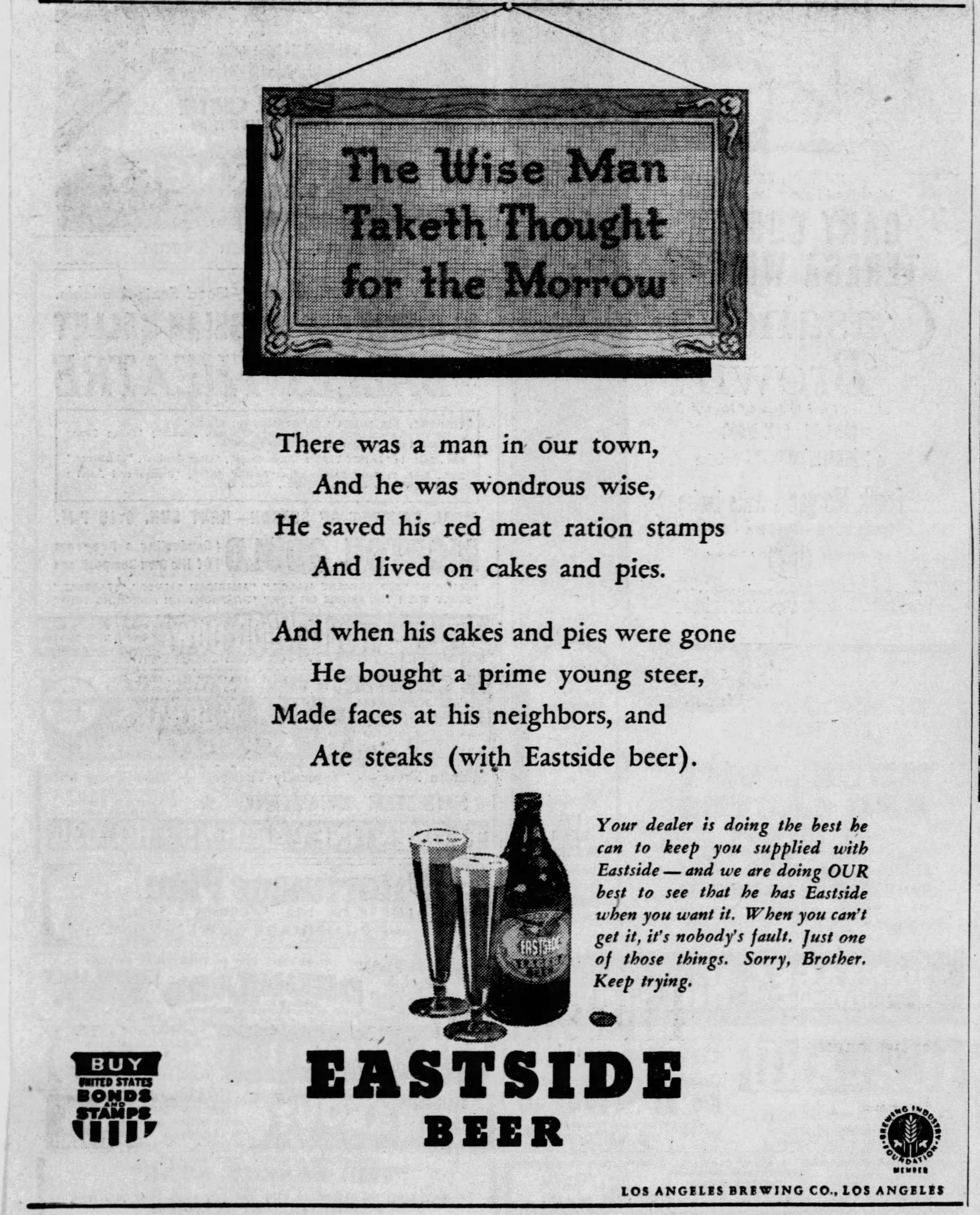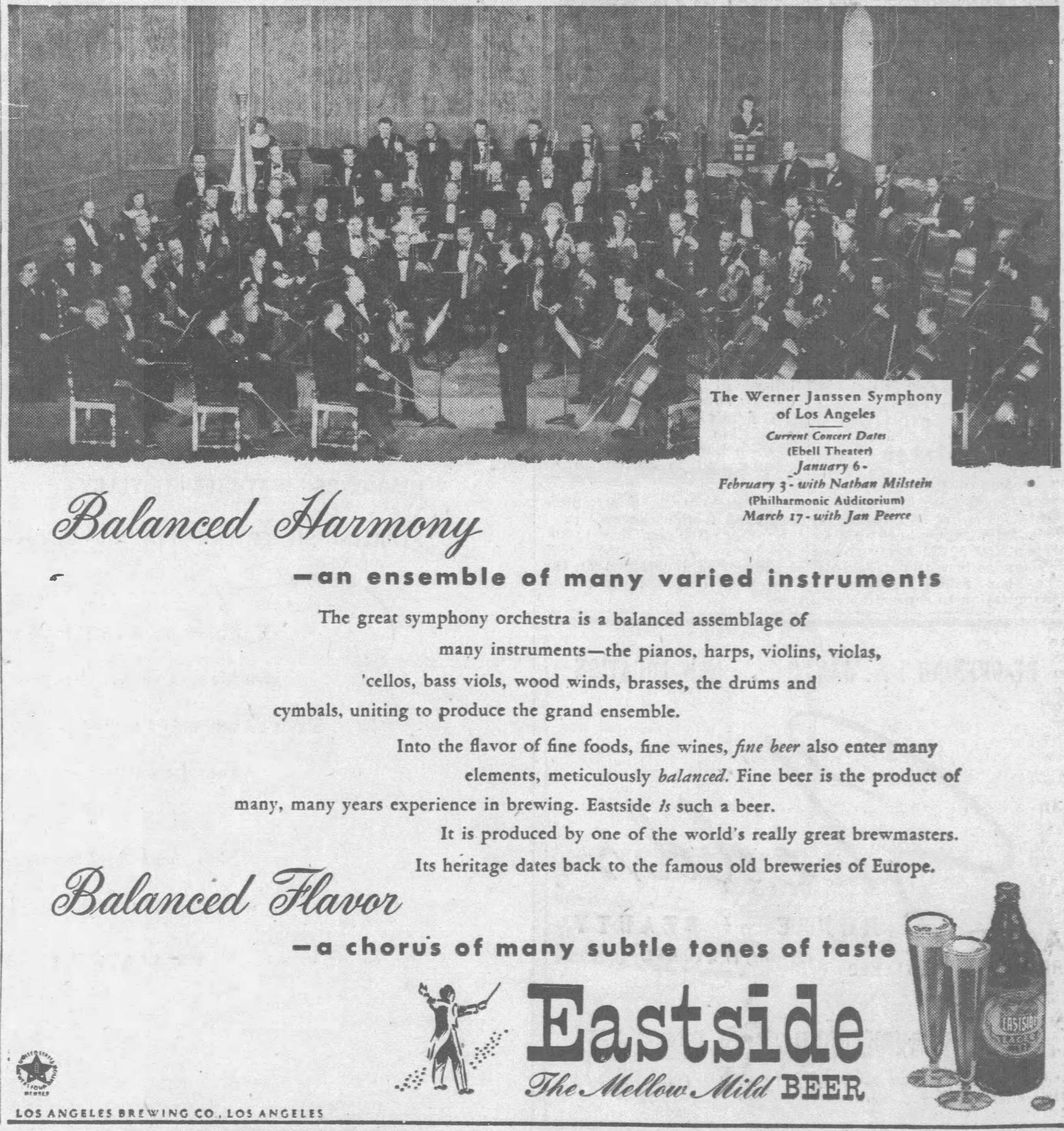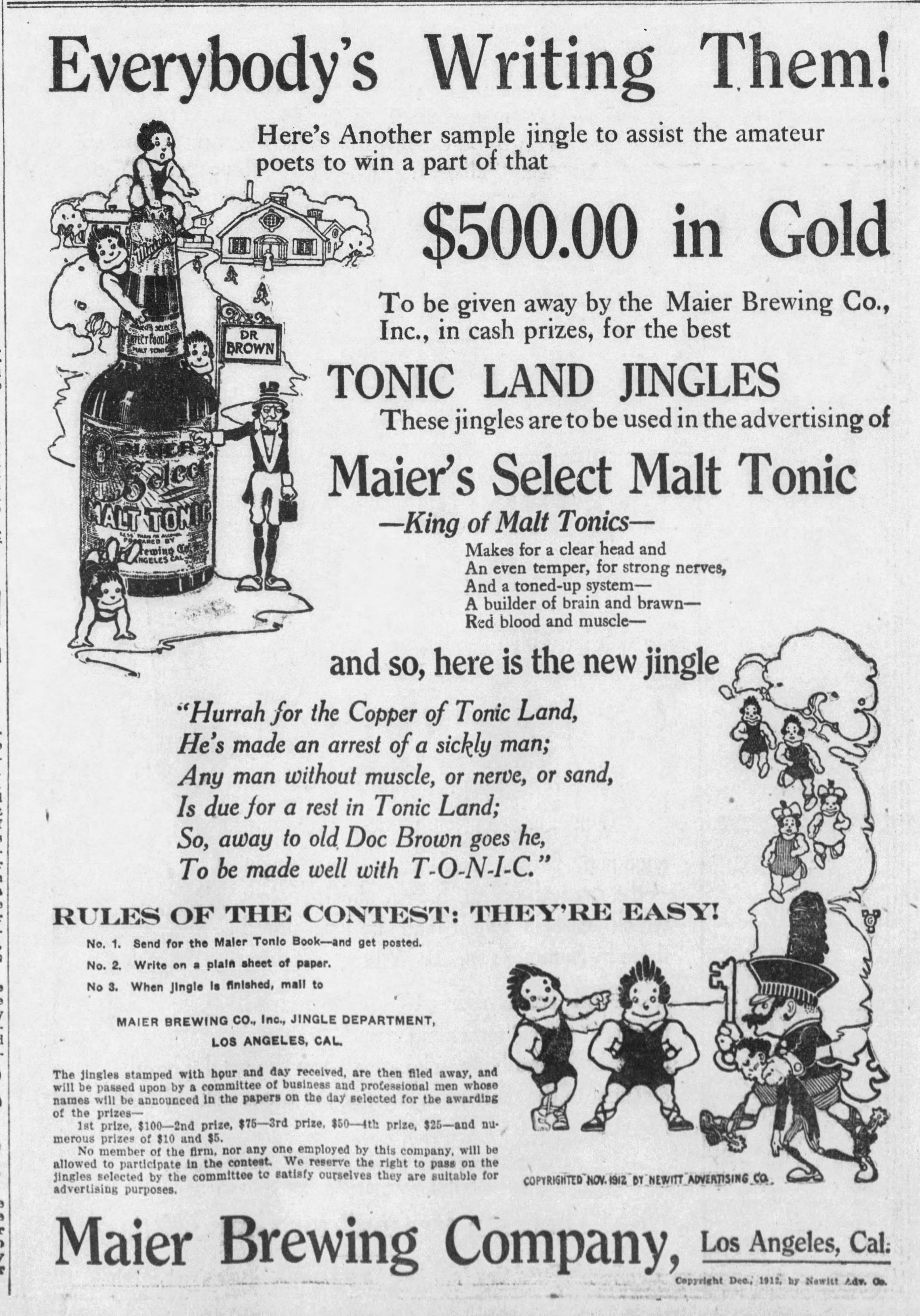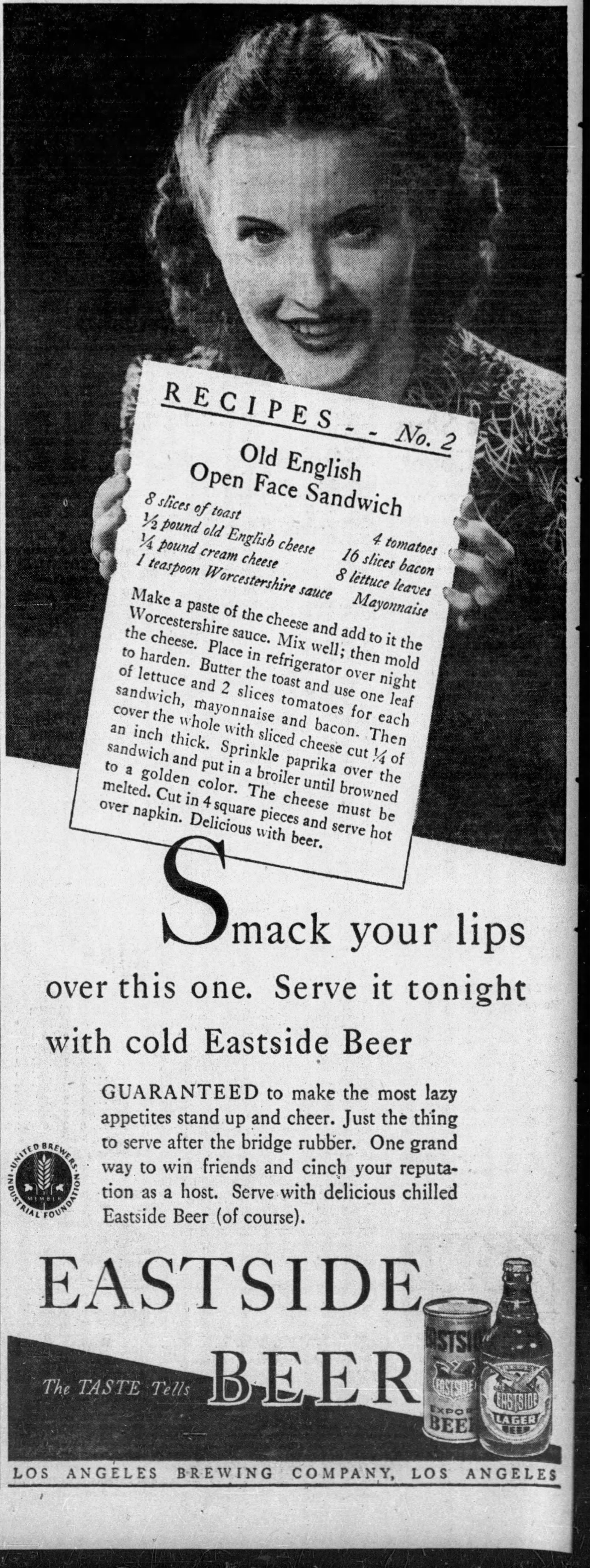 “The Maier Brewing Company started as the Ed. Preuss & Company Philadelphia Brewery in 1874. The following year, it became the D. Mahlstedt Company Philadelphia Brewery, and then the Maier & Zobelein Brewery, located in Los Angeles, in 1882. When Maier and Zobelein dissolved their partnership in 1907, the brewery became the Maier Brewing Company, located at 500 East Commercial Street, Los Angeles. Existing for several decades, the Maier Brewing Company was purchased by the General Brewing Company in 1971, but was later closed in 1974. Eastside Beer was bottled by Los Angeles Brewing Company, owned by George Zobelein, a former partner of Maier and Zobelein Brewery. After the two split in 1907, Zobelein named his new beer ‘Eastside’ since Los Angeles Brewing Company was located east of the Los Angeles River at 600 Moulton Avenue, and the 1920-2026 block of Main Street. The bottling facility was eventually sold and became the Pabst Brewery.”