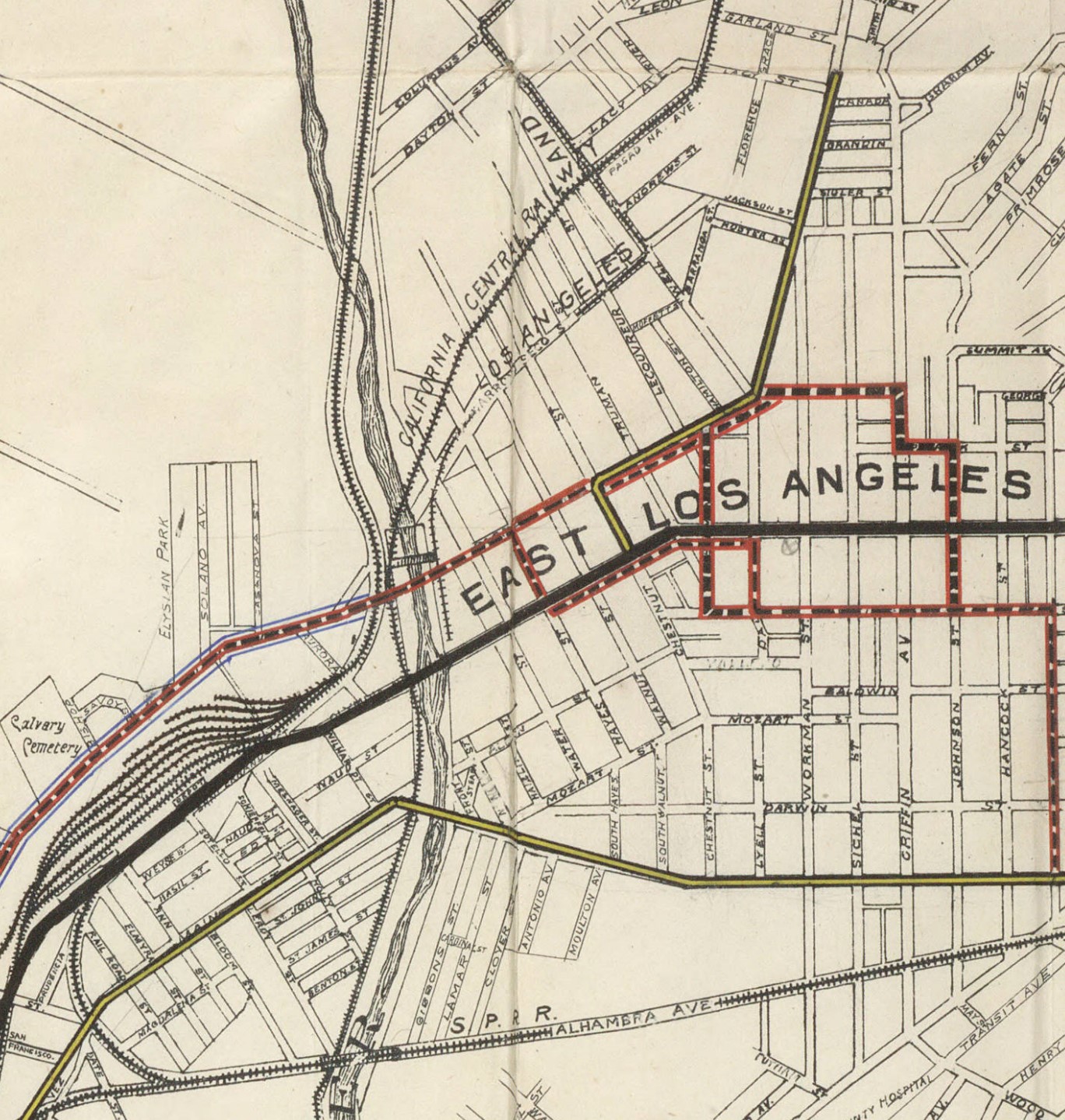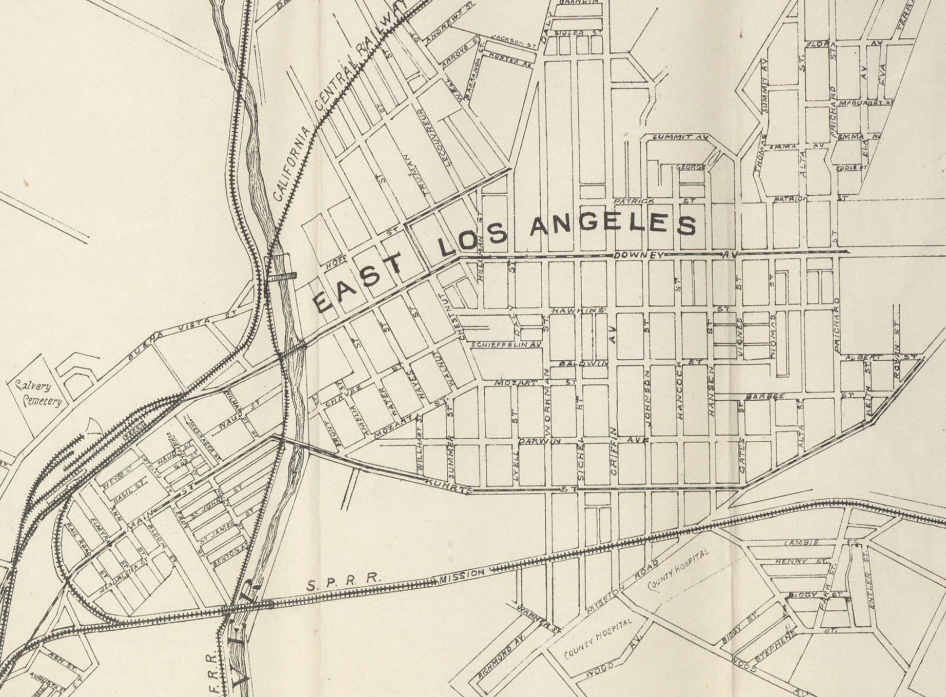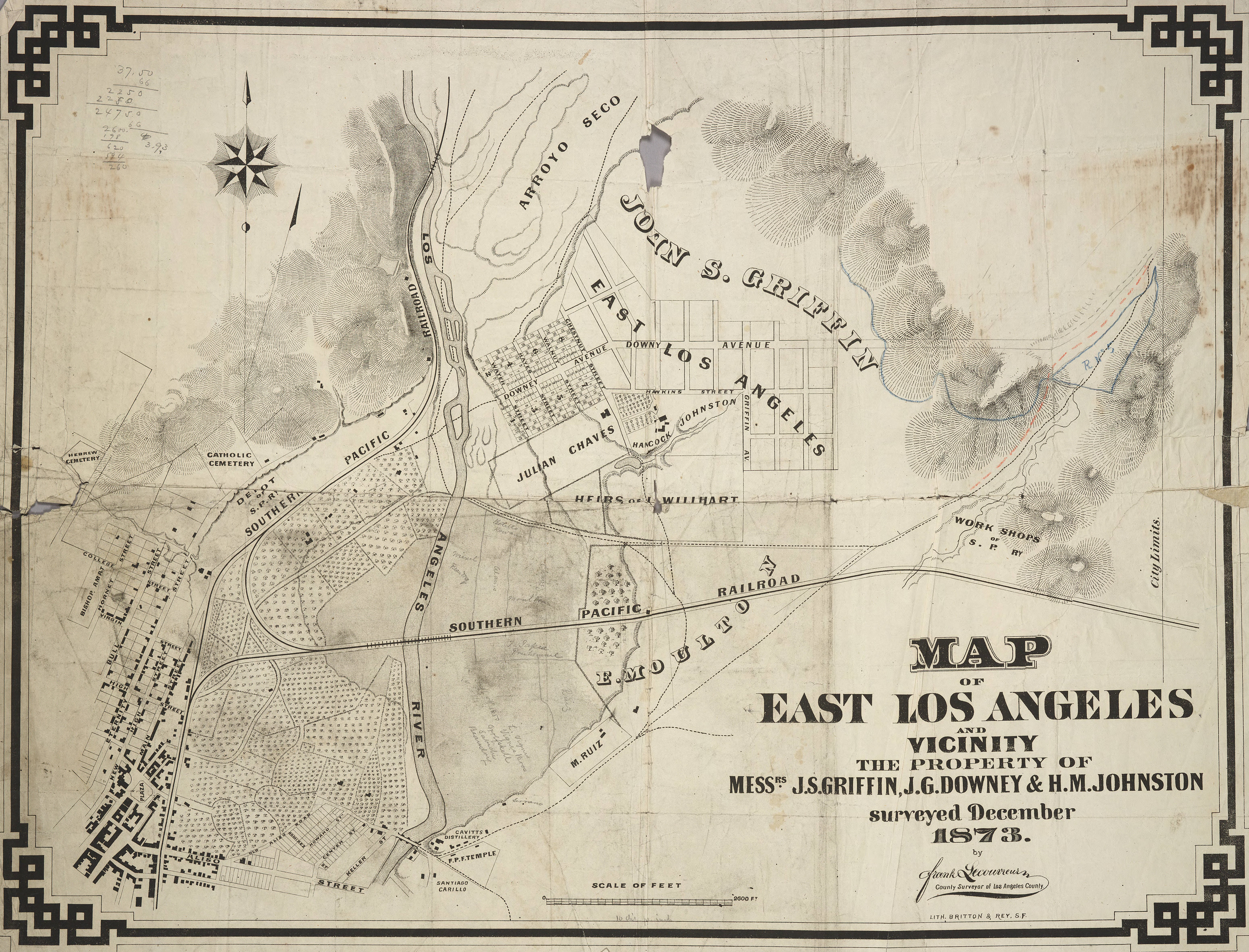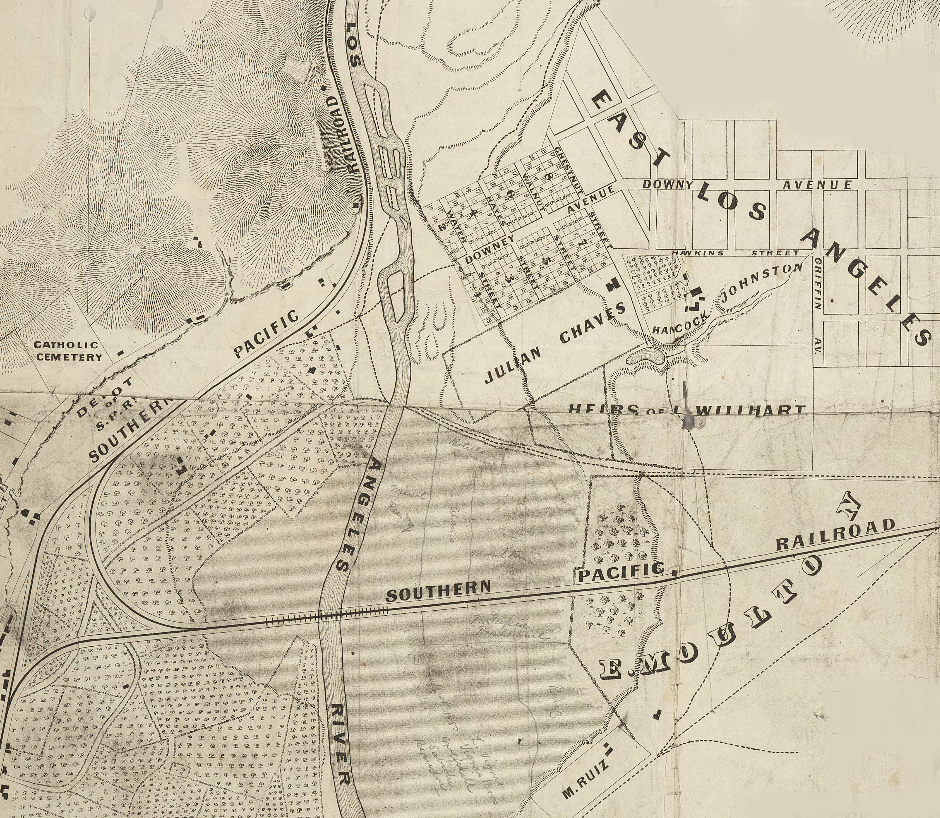 -Images courtesy of the Huntington Digital Library, Huntington Rare Book Maps, “Map of East Los Angeles and Vicinity the Property of Messrs. J. S. Griffin, J. G. Downey & H. M. Johnston,” by Frank Lecouvreur, County Surveyor of Los Angeles County, surveyed December 1873