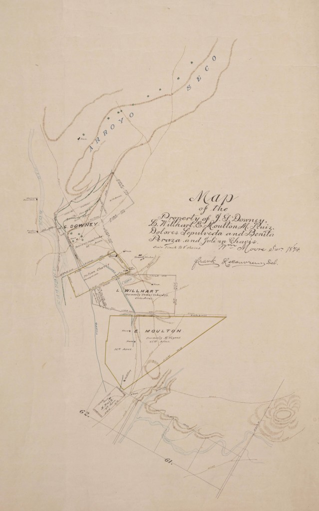 -Image courtesy of the Huntington Digital Library, Huntington Rare Book Maps, “Property of J. G. Downey, L. Willhart, E. Moulton, M. Ruiz, Dolores Sepulveda and Benita Peraza and Julian Chavis,” by Frank Lecouvreur, County Surveyor of Los Angeles County, 1874