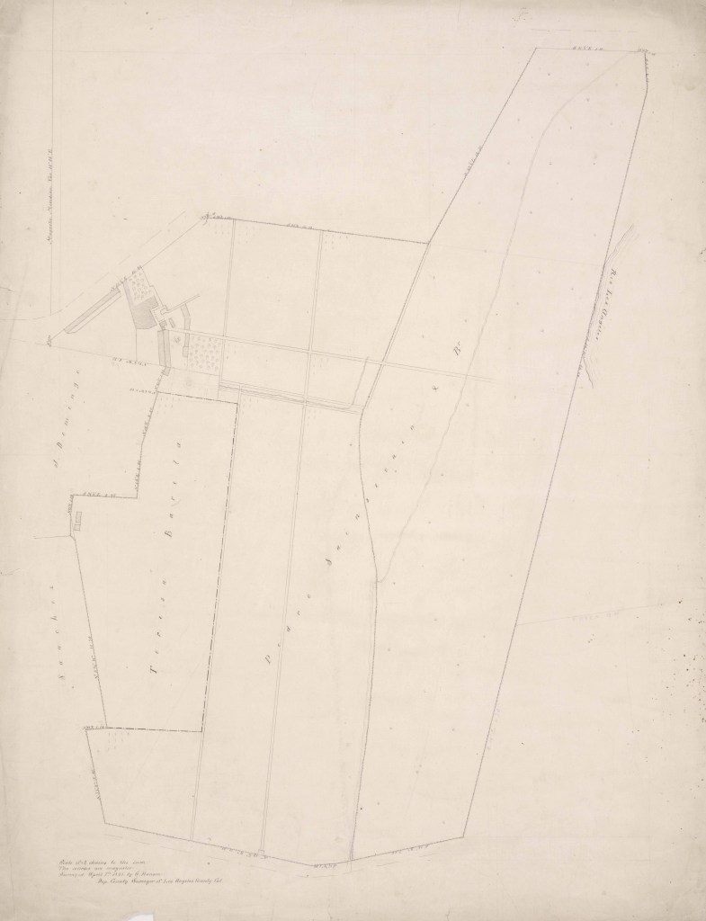 -Image courtesy of the Huntington Digital Library, Solano-Reeve collection, “Vigné Vineyard sold to Barela and Sainsevain; between San Pedro road and Los Angeles River; structures, surface detail; bearings,” by George Hansen, April 7, 1855
