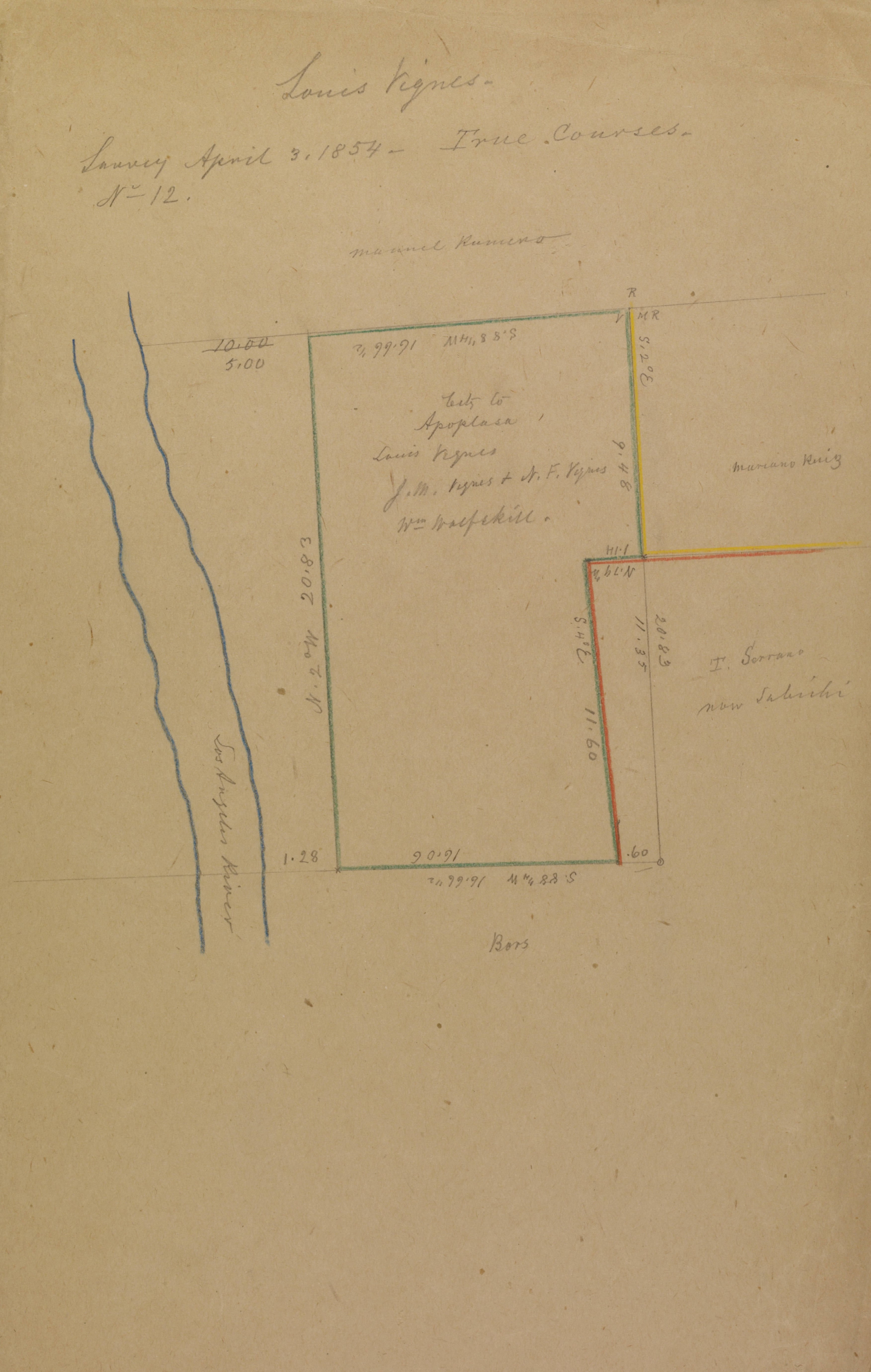 -Image courtesy of the Huntington Digital Library, Solano-Reeves collection, “Tract of land belonging to Don Luis Vigné: East of Los Angeles River. Parcel owners indicated along with stations and bearings; shows Los Angeles River to the west of the tract,” by George Hansen, April 3, 1854