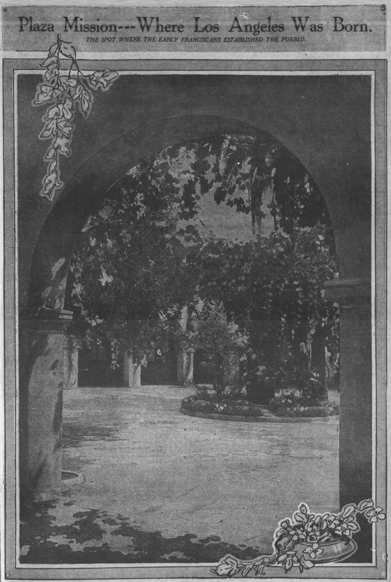 "Artist's sketch of Juan Domingo's large adobe home and vineyard located on the corner of Alameda and Aliso streets. Domingo's real name was Johann Gronigen, a native of Holland who came to America as a ship carpenter. He settled in Los Angeles, and by reason of his arrival in town on a Sunday, and the difficult pronunciation of his German name, the natives called him Juan Domingo."